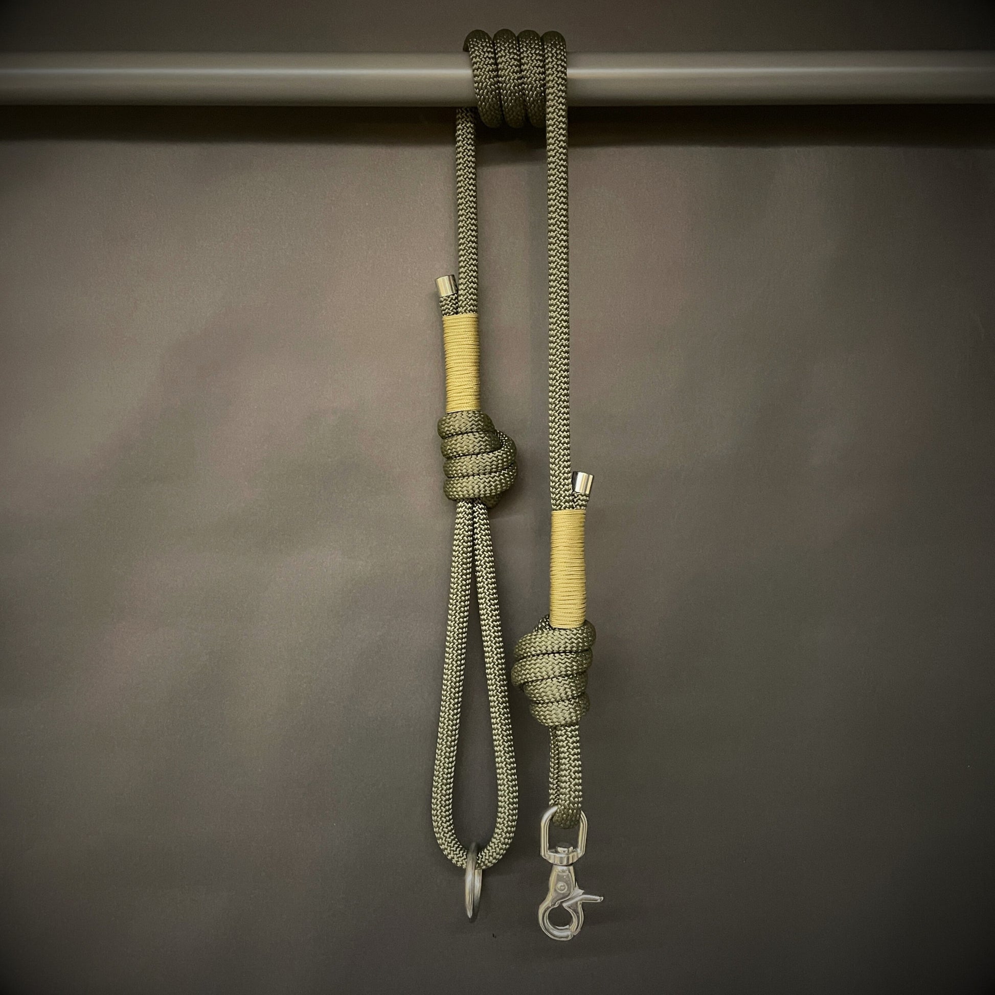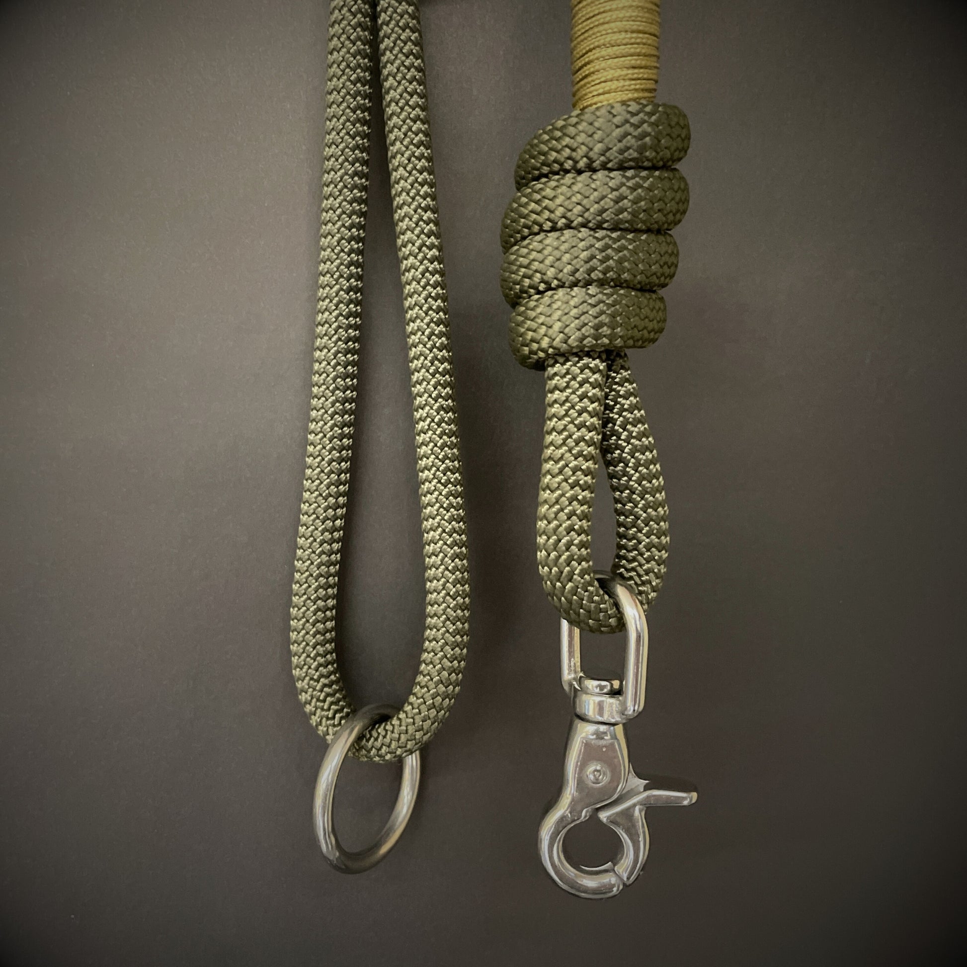 In your choice of Café Latte, Army Green, or Black, and enhanced with a 275 paracord wrap, this lead brings an extra layer of grip and style. It's a functional and eye-catching piece of gear, designed for those who value quality craftsmanship, utility, and understated adventure aesthetics.